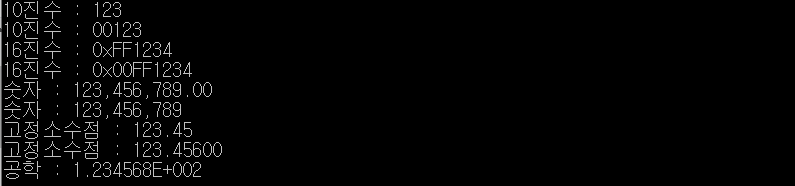 - 서식 문자열은 앞의 표에서 언급한 서식 지정자와 함께 "자리수 지정자"를 사용할 수 있다.