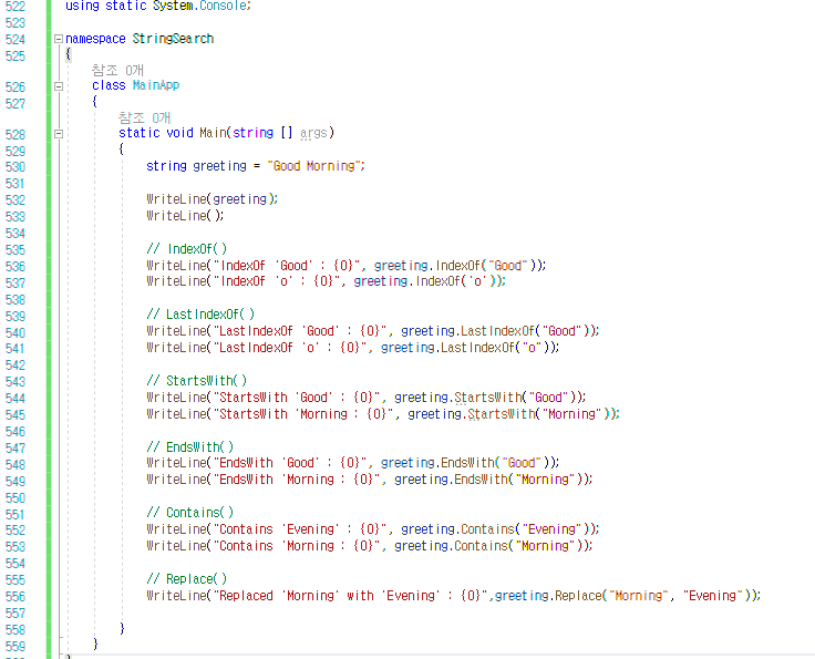 | LastIndexOf() | 현재 문자열 내에서 찾고자 하는 지정된 문자 또는 문자열의 위치를 뒤에서부터 찾는다. |