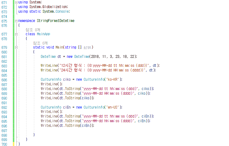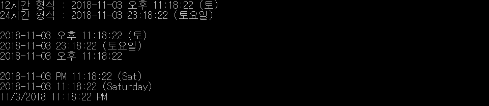 | DateTime dt = new DateTime{2018, 11, 3, 23, 18, 22}; // 12시간 형식 : 2018-11-03 오후 11:18:22 (토) WriteLine("12시간 형식 : {0:yyyy-MM-dd tt hh:mm:ss (ddd)}", dt); // 24시간 형식 : 2018-11-03 23:18:22 (토요일) WriteLine("24시간 형식 : {0:yyyy-MM-dd HH:mm:ss (dddd)}", dt); |