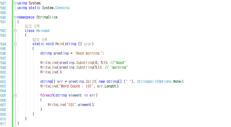 - string 형식은 위와 같이 콤마(,)로 구분된 문자열에서, 콤마를 제외한 내용을 Split() 메소드로 단번에 배열로 만들 수 있다.
