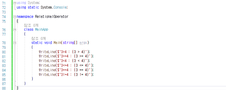 - 두 피연산자 사이의 관계를 평가하는 연산자