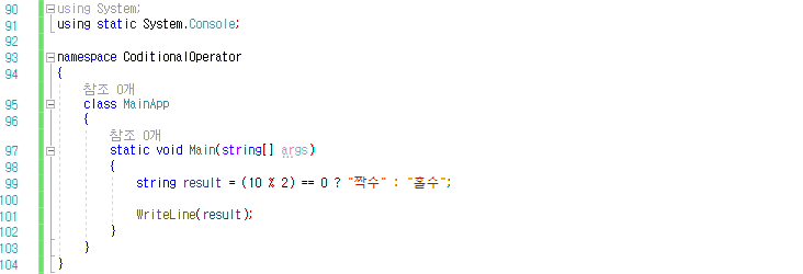 | 조건식 ? 참일 때의 값 : 거짓일 때의 값 |