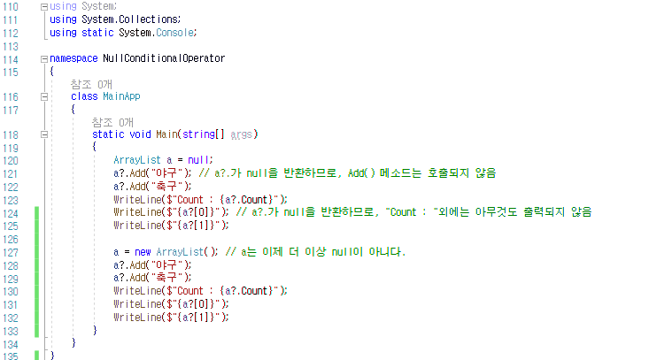 WriteLine($"{a?[0]}"); // a?.가 null을 반환하므로 "Count : "외에는 아무것도 출력되지 않음 .