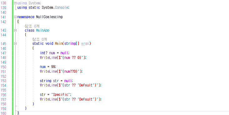 - null 병합 연산자(??)는, null 조건부 연산자(?.)처럼, 프로그램에서 종종 필요한 변수/객체의 null 검사를 간결하게 만들어주는 역할을 한다.