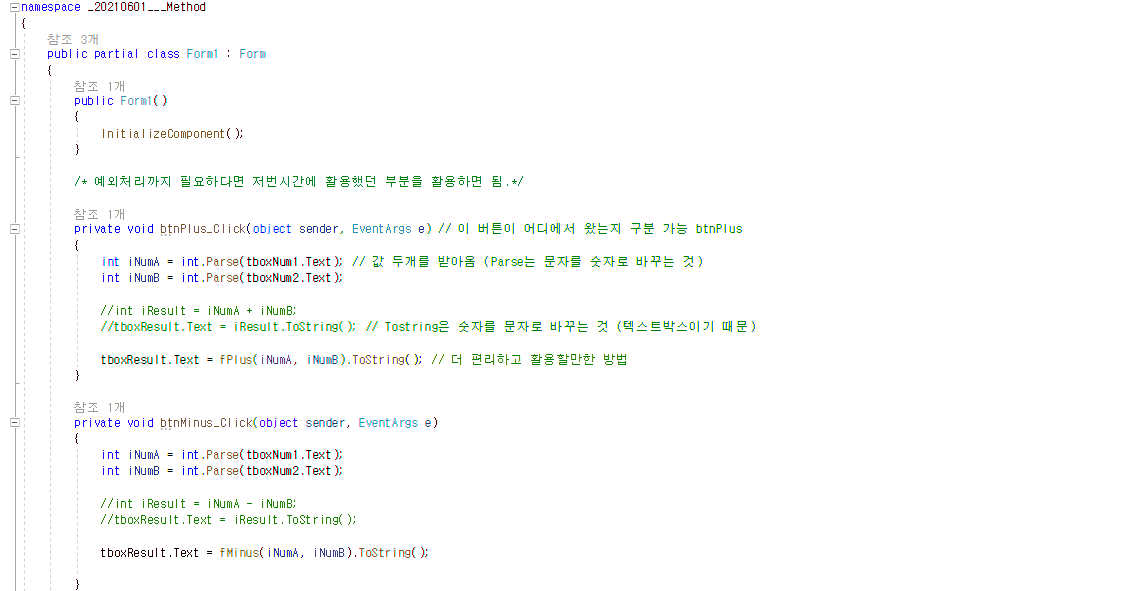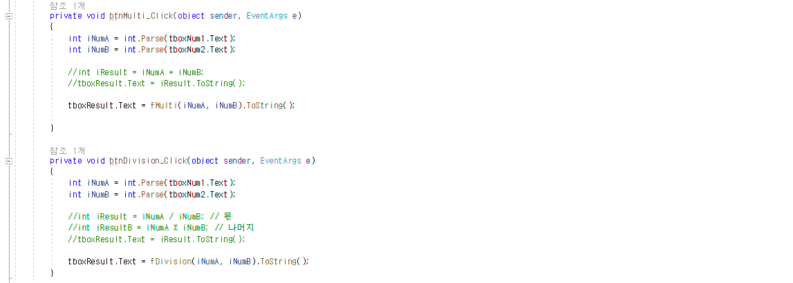 tboxResult.Text = fPlus(iNumA, iNumB).ToString(); // 더 편리하고 활용 할만한 방법
