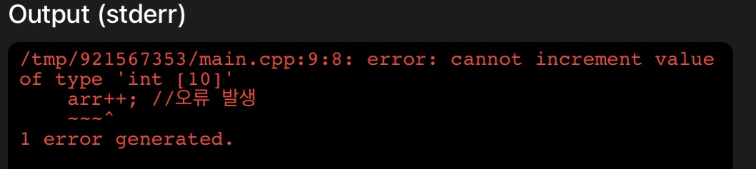 배열의 이름이 첫 번재 원소를 가리키는 포인터로, 타입 변경된다고 했지만, 이는 단순히 배열의 첫 번째 원소를 가리키는 주소값 자체가 될 뿐이다. 즉, arr은 상수이기 때문에, 주소값 자체가 변경될 수 없다는 것이다.