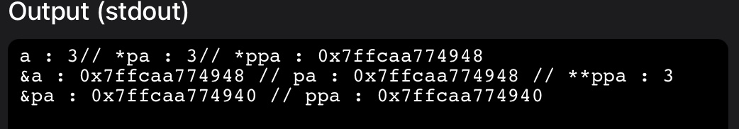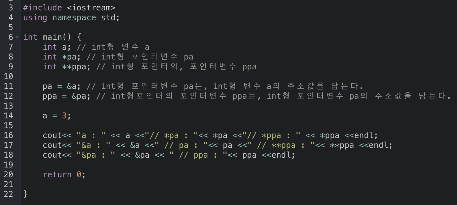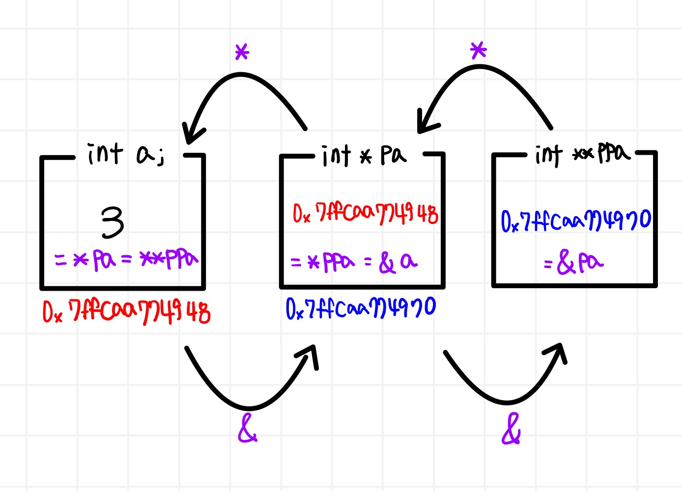 - 그 포인터변수의 주소를 가르키는, 포인터가 존재할 수 있다. (얼마든지 원한다면 설정 가능)