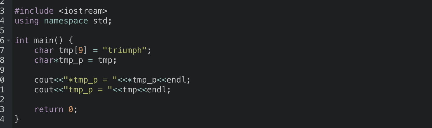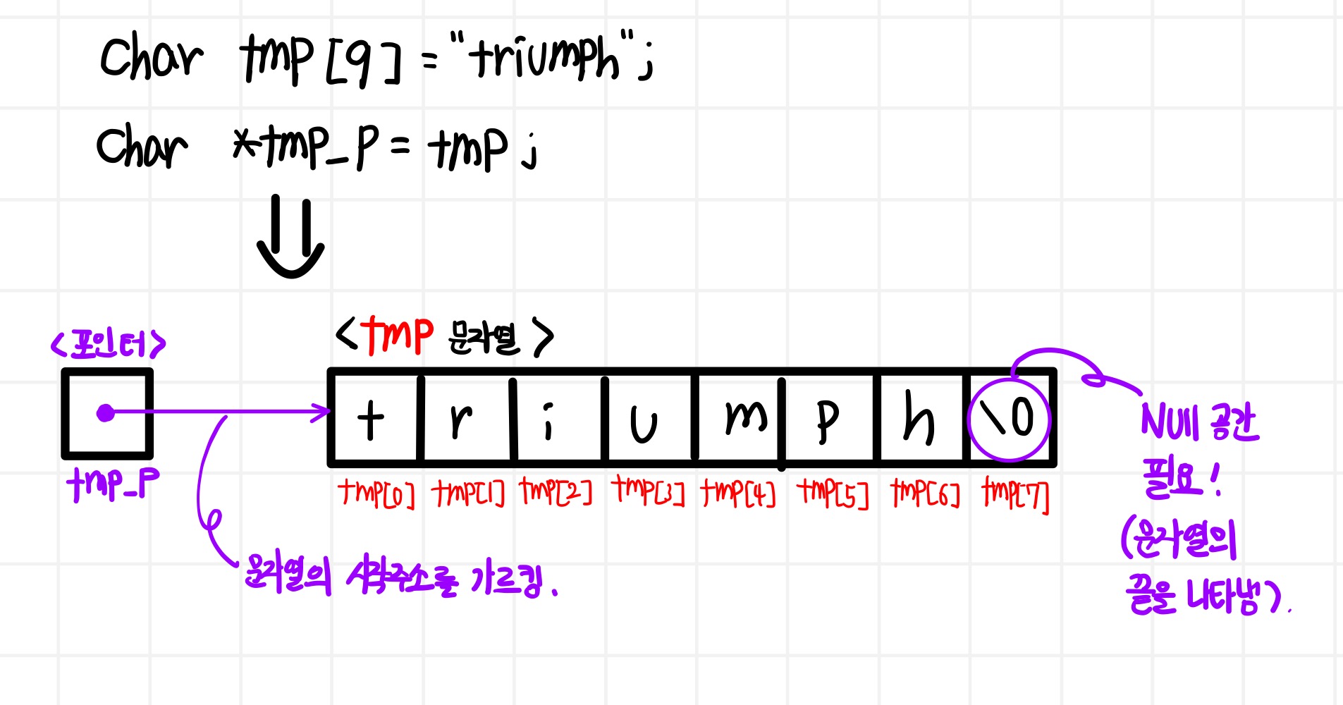 - 포인터는 문자열의 첫번째, 시작되는 주소를 가르키게 된다.