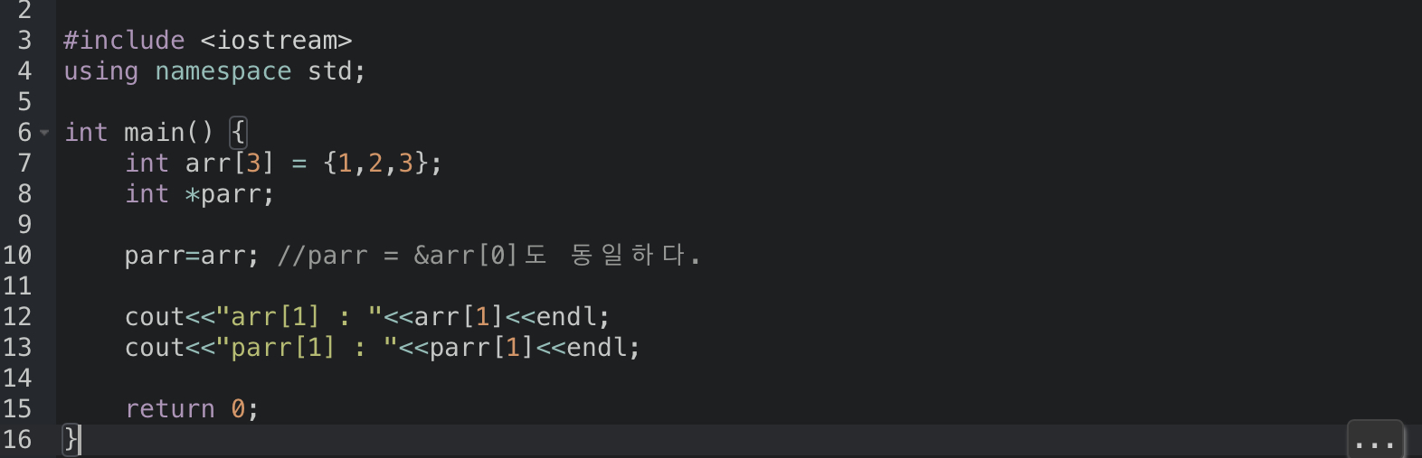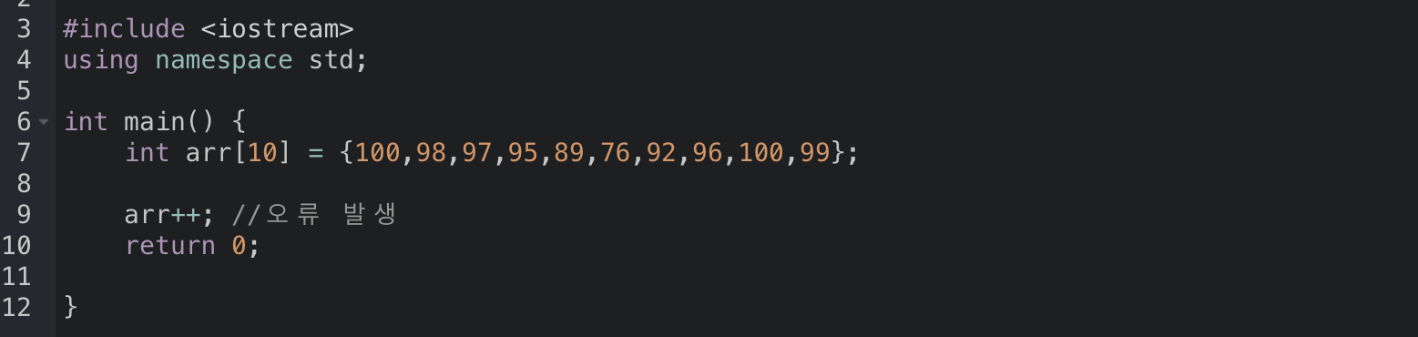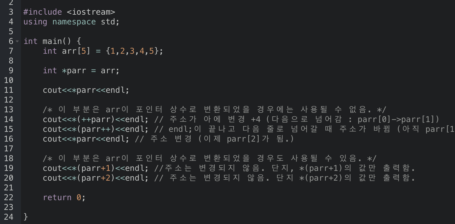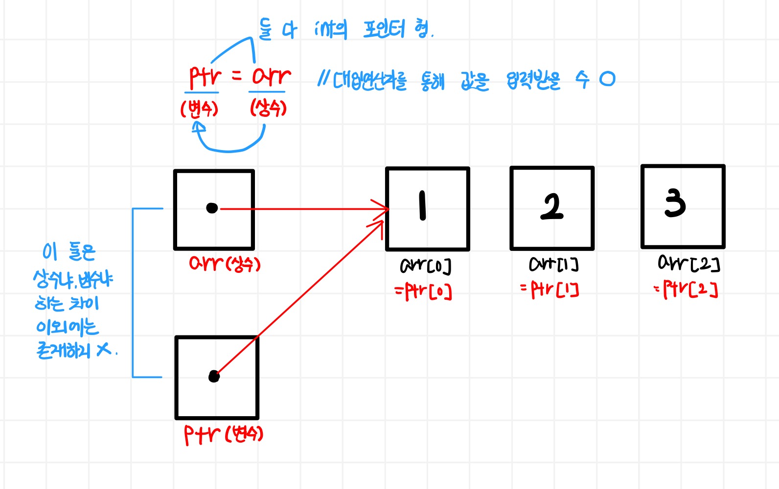 - 그러나 ptr은 변수이기 때문에, 다른 값의 주소를 가르킬 수 있지만, arr은 상수이기 때문에 다른 주소를 가리킬 수 없다. 이 차이를 분명하게 인지하고 있어야 한다.