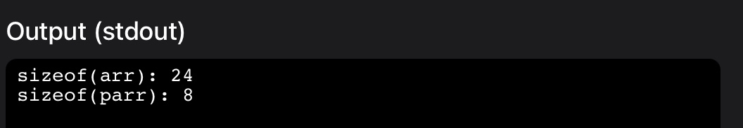 sizeof(arr) : 배열의 실제크기가 나온다. 즉, arr배열에는 int원소 6개가 있으므로, 크기가 4*6 = 24가 된다.
