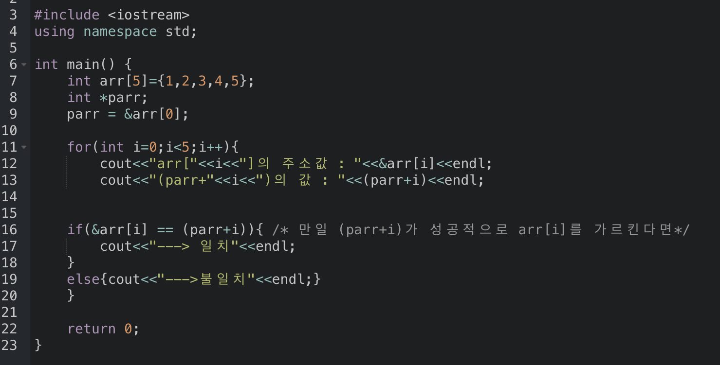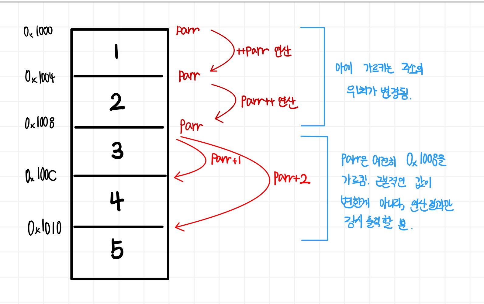 // 포인터변수에서 1을 증가시킨다면, parr에 저장된 주소값에 1이 더해지는 것이 아니라, 4가 더해지게 되면서 배열의 그 다음 원소를 가리키게 된다.