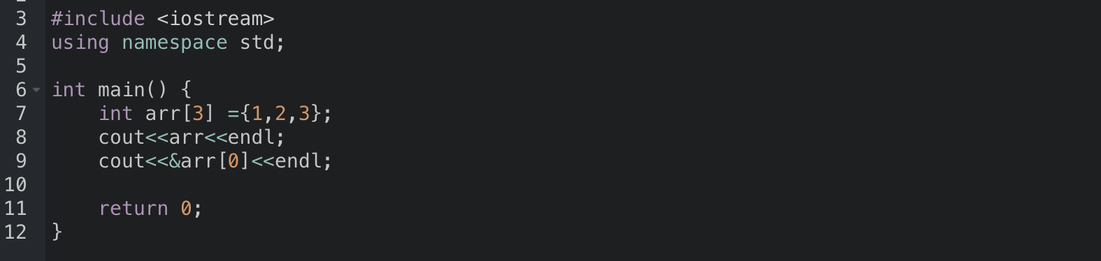 따라서, arr의 경우, 첫 번째 원소를 가리키는 포인터로 타입 변환되기 때문에, &arr[0]과 일치하게 된다.